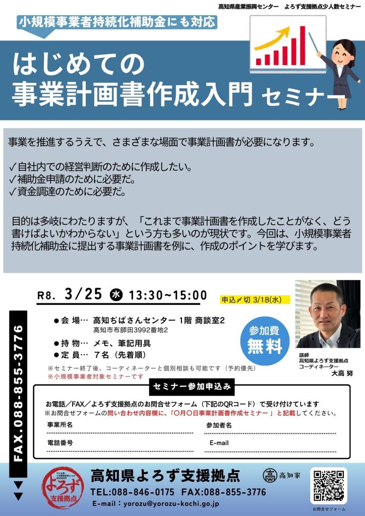 令和8年3月25日(水) 小規模事業者持続化補助金にも対応 はじめての事業計画書作成入門セミナー